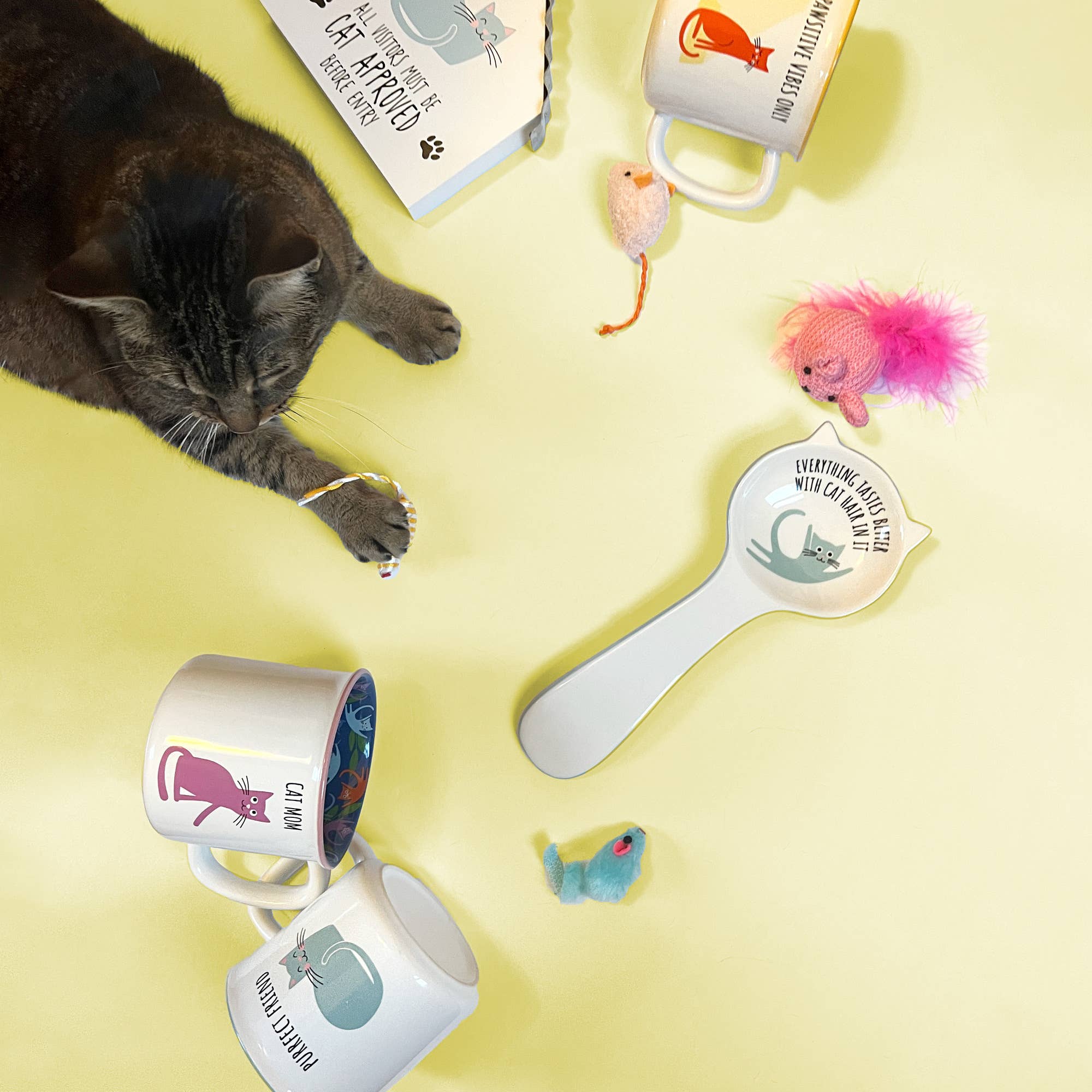 This modern-style stoneware mug is not just a mug; it's a statement piece. Its 18 oz capacity makes it perfect for your morning coffee or a cozy evening tea. The large handle is designed for comfort, and the curved lip enhances your sipping experience. The glossy finish adds a touch of elegance to its bold and versatile look, making it a perfect addition to any kitchen or office space. The mug's front features a purple cat sitting with the sentiment "Cat Mom." The lip of the mug is purple, and the interior is blue with leaping blue, red, and purple cats with greenery. We understand that convenience is critical in your busy life. This stoneware mug is dishwasher and microwave-safe, making it easy to clean and use. It is also packaged in a die-cut box for safe shipping, ensuring it arrives in perfect condition at your doorstep. .