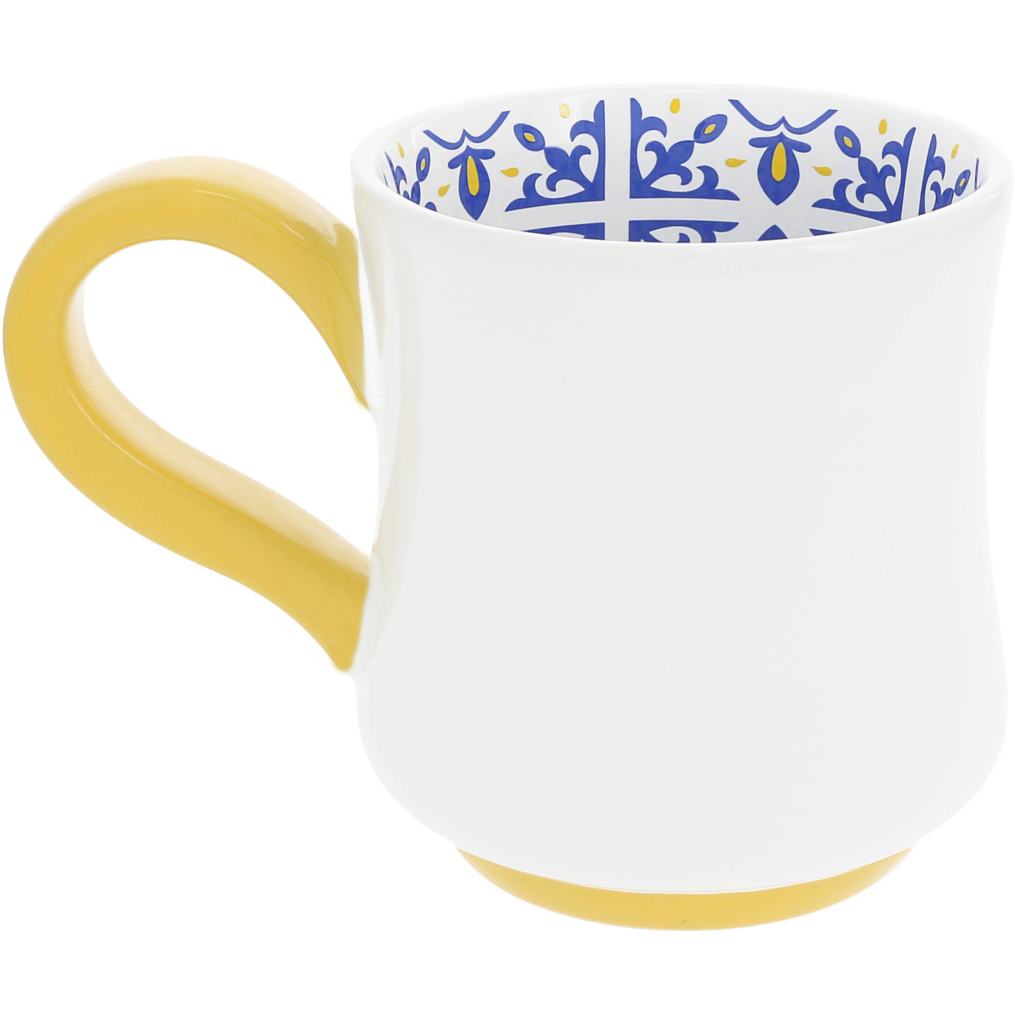 The Mediterranean Dreaming "Ciao Bella" Mug is a stunning tribute to Italy's rich heritage and beauty. This 16 oz stoneware mug boasts a glossy glaze finish, an elegant deep blue and white tile interior, and a vibrant golden-yellow handle that adds a pop of color. The phrase "Ciao Bella" brings a playful and endearing touch, making it the perfect way to start your morning with a warm greeting. Whether enjoying a cappuccino, espresso, or herbal tea, this mug is both stylish and functional. Microwave and dishwasher safe, it is easy to clean and maintain. Packaged in a white die-cut box, it makes a charming and thoughtful gift for travel lovers, Italian culture enthusiasts, and coffee aficionados alike.