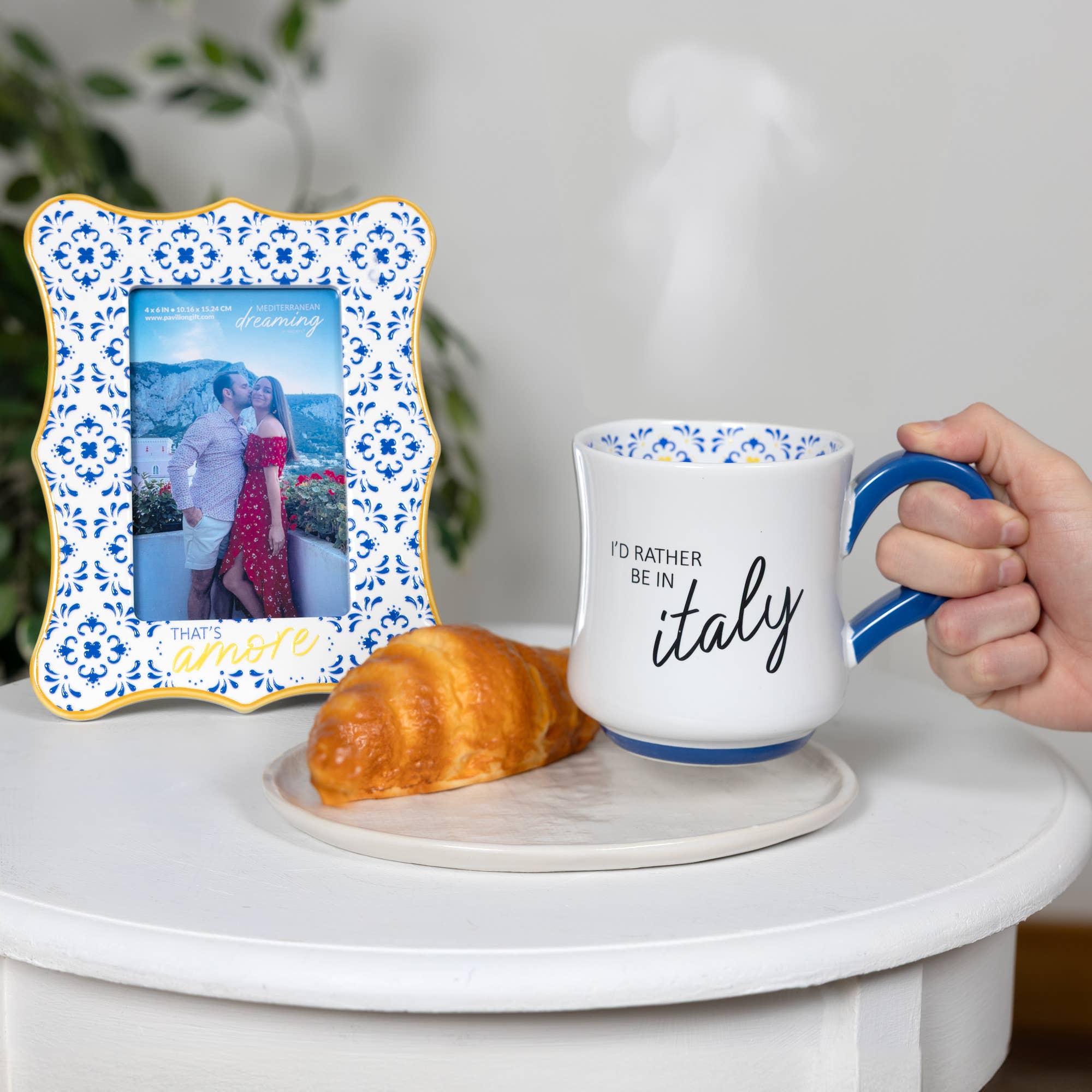 The Mediterranean Dreaming "Italy" Mug is perfect for those who long for sun-soaked Italian mornings. This 16 oz stoneware mug features a glossy glaze, embossed Mediterranean tile-inspired artwork, and a vibrant blue handle for a stylish contrast. The phrase "I'd Rather Be in Italy" is elegantly scripted across the front, making it a great conversation piece for coffee lovers and travelers alike. Whether you're enjoying a morning cappuccino or an afternoon tea, this mug is microwave and dishwasher safe, ensuring convenience and easy maintenance. Beautifully packaged in a white die-cut box, it makes a thoughtful and stylish gift for any Italy enthusiast.