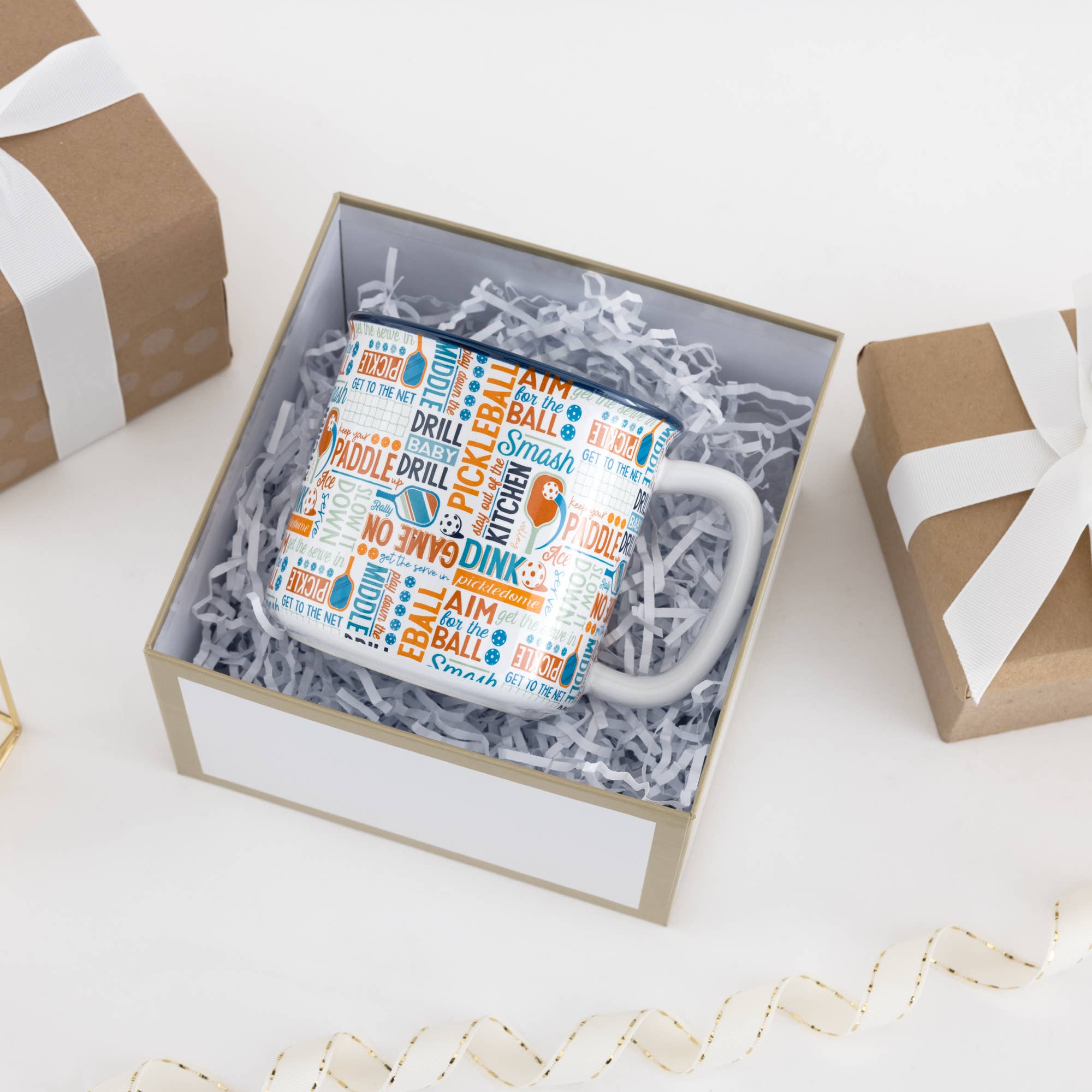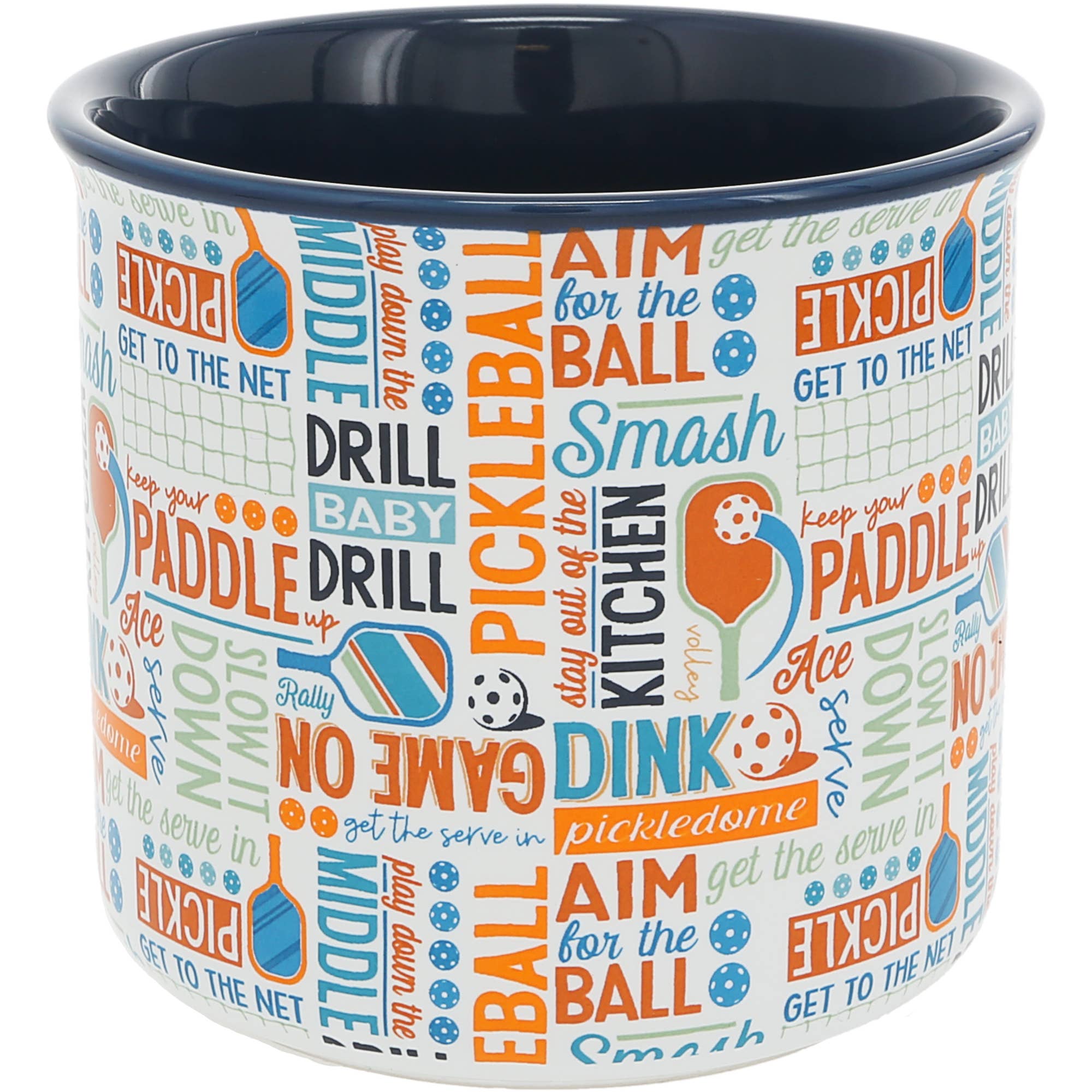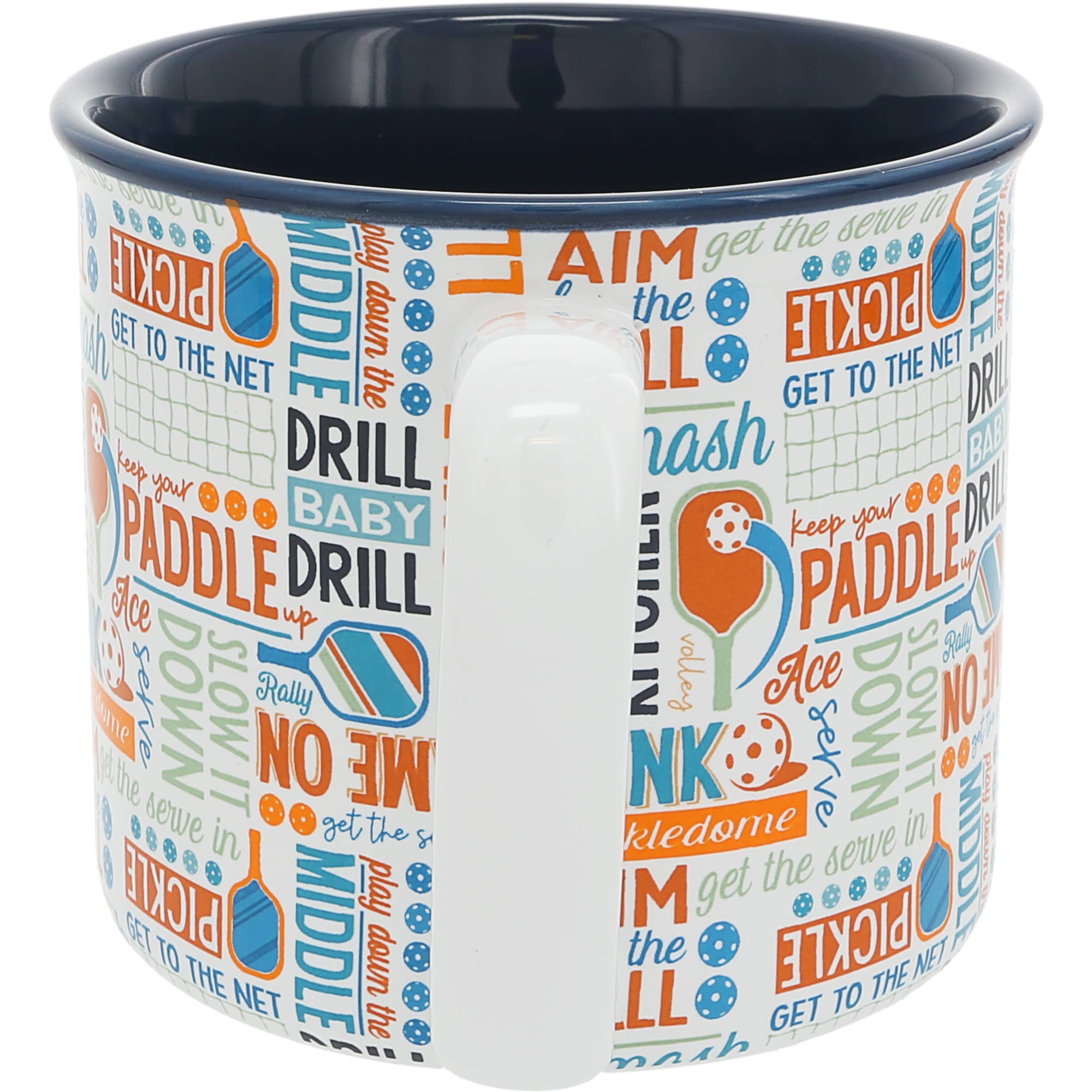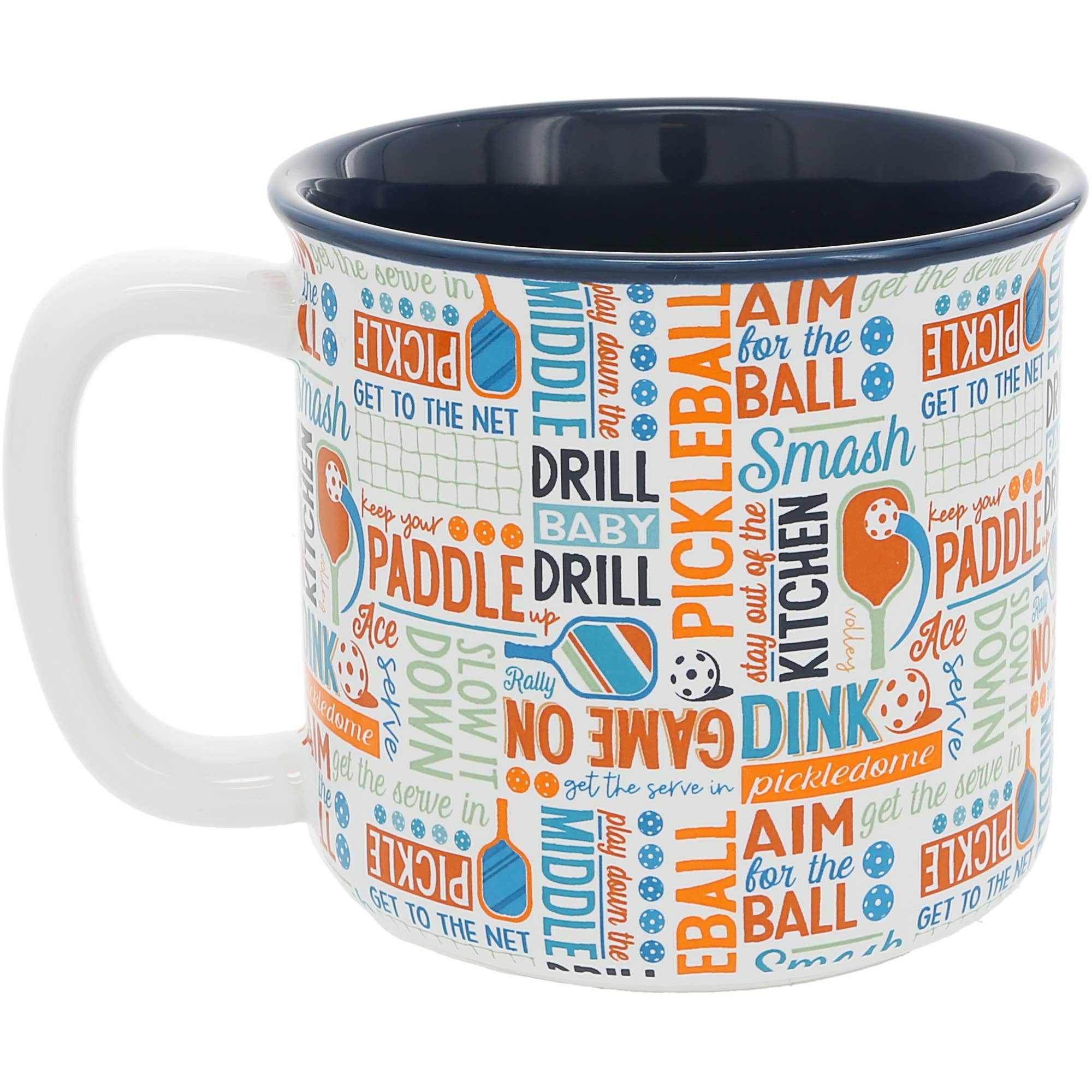 The 18 oz stoneware mug features a curved rounded lip and a sturdy comfortable fit handle, providing a comfortable and enjoyable drinking experience. With its blue interior color and white exterior, this mug has a stylish and modern look. The straight-edge vessel adds a touch of sophistication to your beverage enjoyment. This 18 oz mug has an exterior with a colorful white, orange, and teal "Pickleball, Get The Serve, Aim For The Ball, Smash, Stay Out Of The Kitchen, Dink, Pickledome, Bounce, Serve, Play Down The Middle, Drill Baby Drill, Slow It Down, Keep Your Paddle, Get To The Net, Ace, Keep Your Paddle Up, Rally" word splash wrap-around pattern. The sturdy handle on the right side ensures a comfortable grip for sipping your favorite beverage. . Dishwasher safe, making it convenient and easy to clean. You can simply place it in the dishwasher for hassle-free maintenance, allowing you to enjoy your coffee or any other beverage without worrying about handwashing. .
